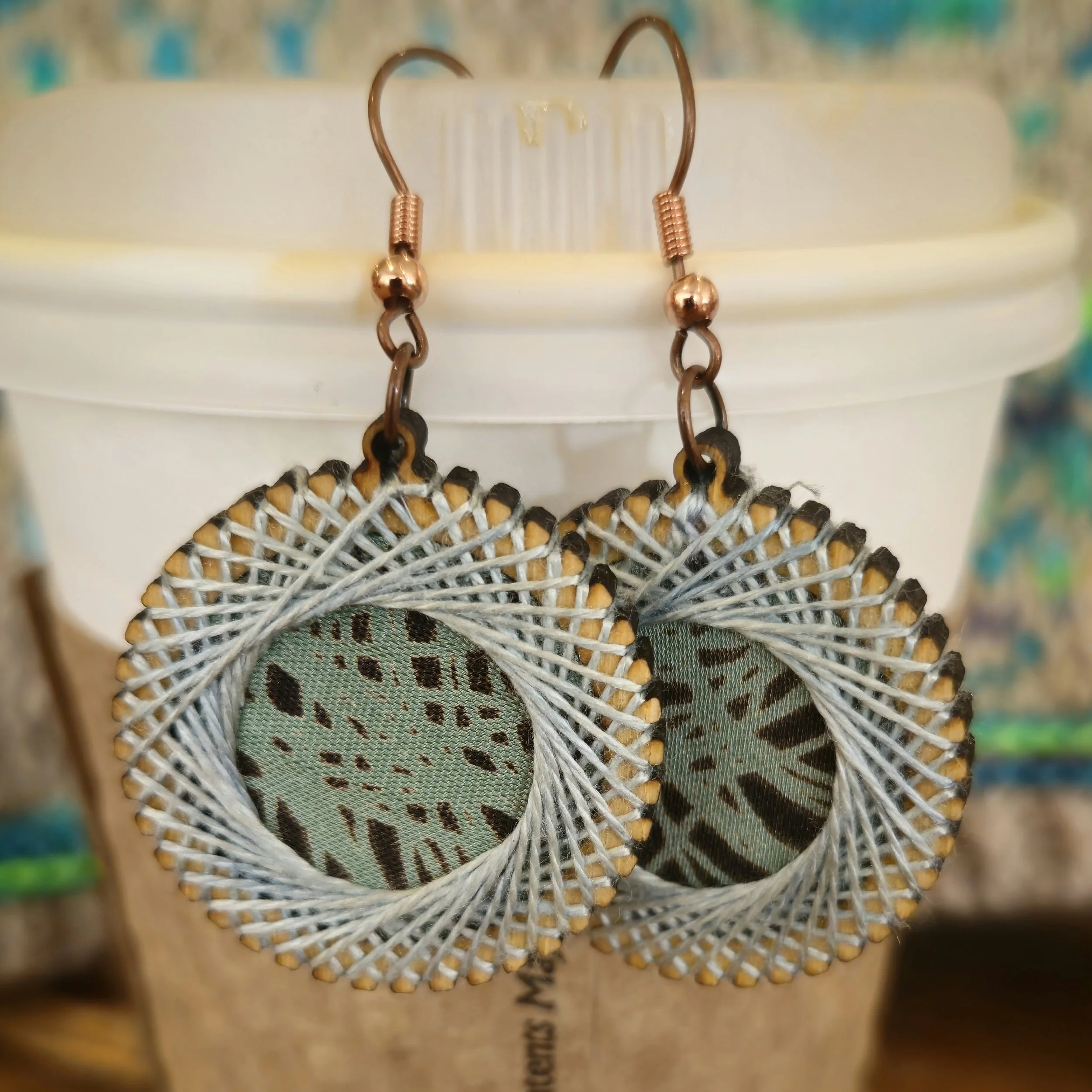 Image 1 of 1 String Art Earrings $35.00 String art with hand dyed silk and vintage fabric. Dark copper findings. 1.25”/32mm diameter manle frames. Add To Cart Added! String art with hand dyed silk and vintage fabric. Dark copper findings. 1.25”/32mm diameter manle frames.